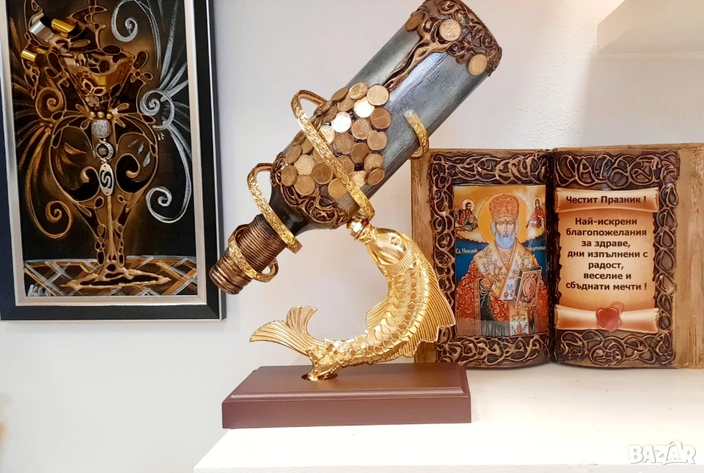 Комплект поставка златна риба изработена от месинг и махагон с юбилейна бутилка декорирана с кожа под формата на торбичка и дървена плочка с пожелание за юбилей 50 години или кръгла годишнина - 40 , 60, 70, 75 и 80 години.