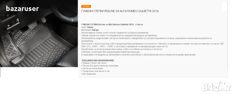 Гумени Стелки RIZLINE за Alfa Romeo Giulietta 2019-/515304 → Обява 31979458