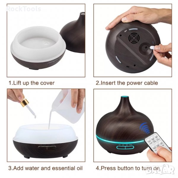 Арома дифузер с етерични масла за домашна ароматерапия е иновативен продукт, който разпръсква вода и етерични масла в дома ви. Добавете в резервоара вода и няколко капки от любимите ви етерични масла.