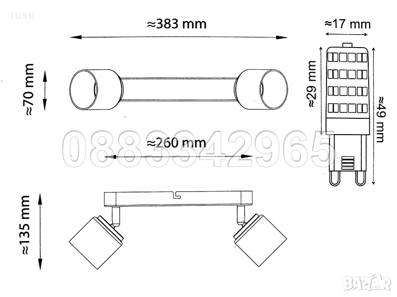 Размер на LED (G9): 2.9 х 1.7 см (без фасунка), с фасунка: 4.9 х 1.7 см