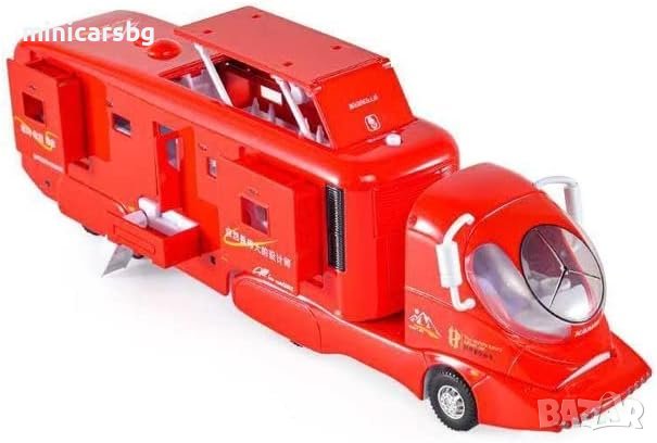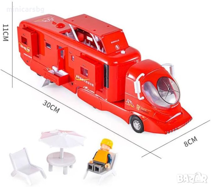 Голям модел кемпер–каравана, комбиниран камион с ремарке – перфектен за фенове на нестандартните машини, декор и игра. Моделът е мащаб 1:50 и е около 30 см дълъг, така че изглежда впечатляващо както в колекция, така и на рафт в стая.