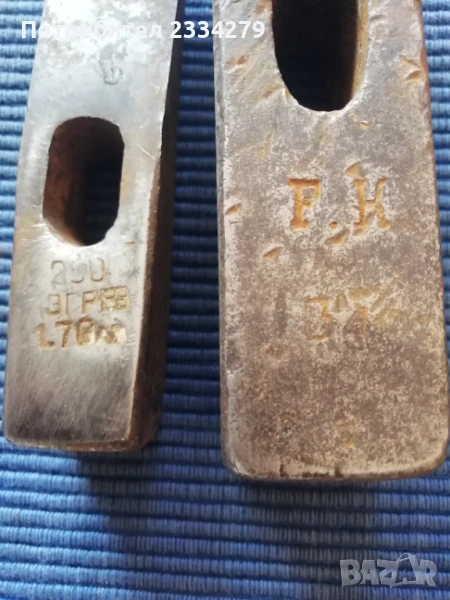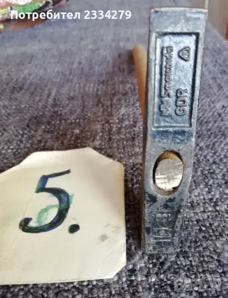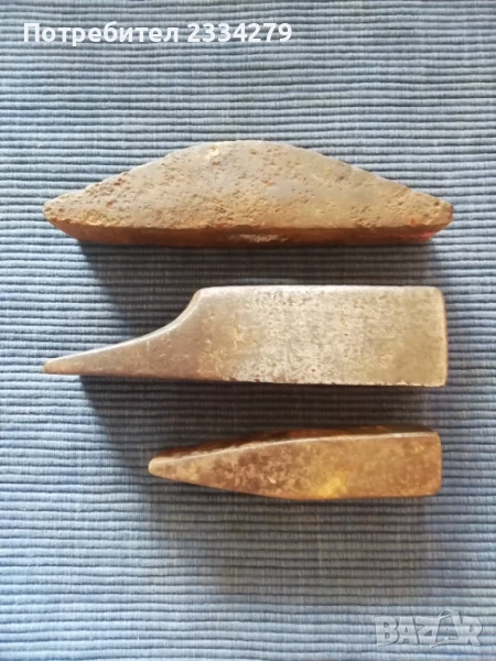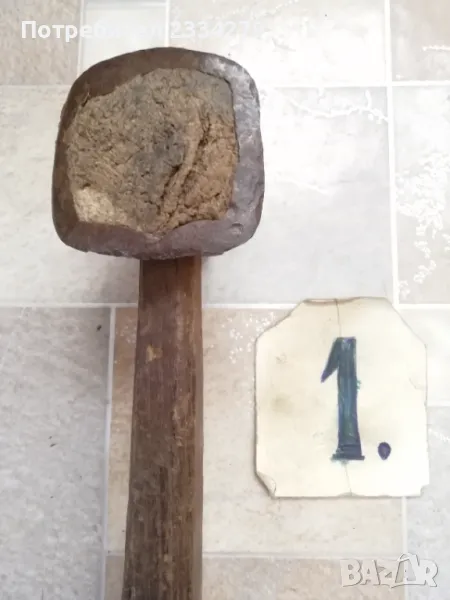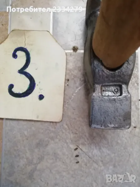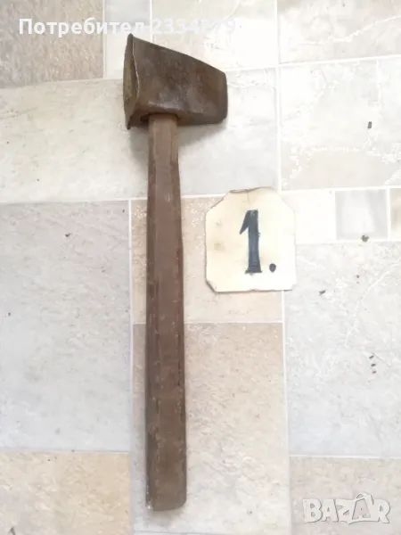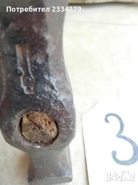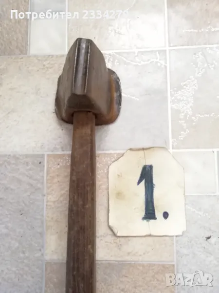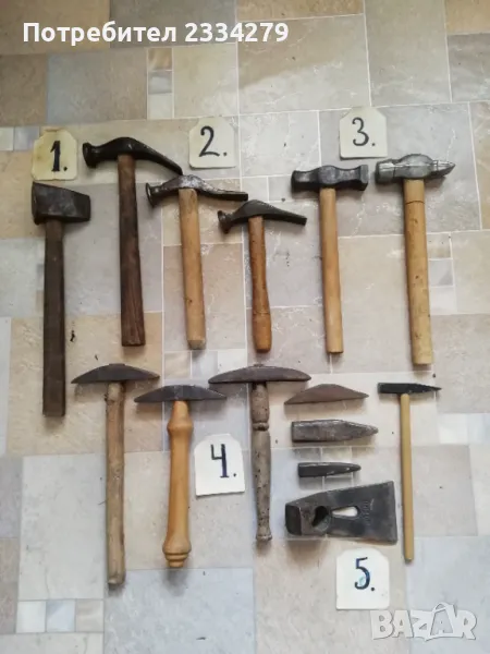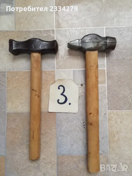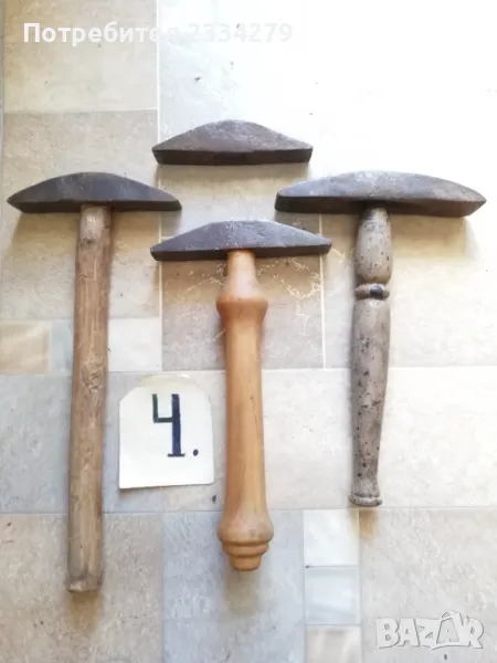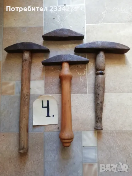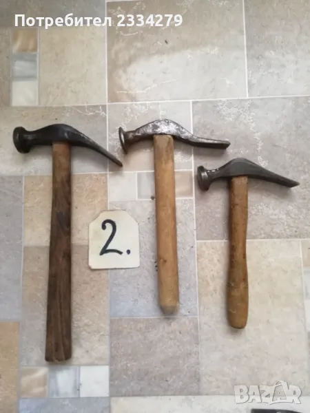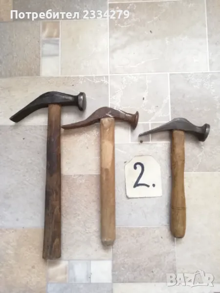 Стари занаяджийски чукове. N:1 Стар рядък кован бъчварски чук от възрожението размери 8х5х5см., цена 9€.; N:2 стари обущарски-кожарски чукове изработени от различни майстори в различни времена, размери 15х4см., 13х3см., цена 10€. за брой; N:3 стари занаяджийски тенекичийски чуковв: немски,,Солинген" има щемпъл, размери 11х3х3см., цена 9€., другият е български с размери 11х4см.,има щемпъл, от 60-те години, цена 5€.; N:4 стари ръчно ковани чукове за клепане на коси и сърпове, цена 8€.; N:5-6 други различни чукове от времето на СОЦА. Единият е немски с инициали, цени 4€, теслата е 5€.