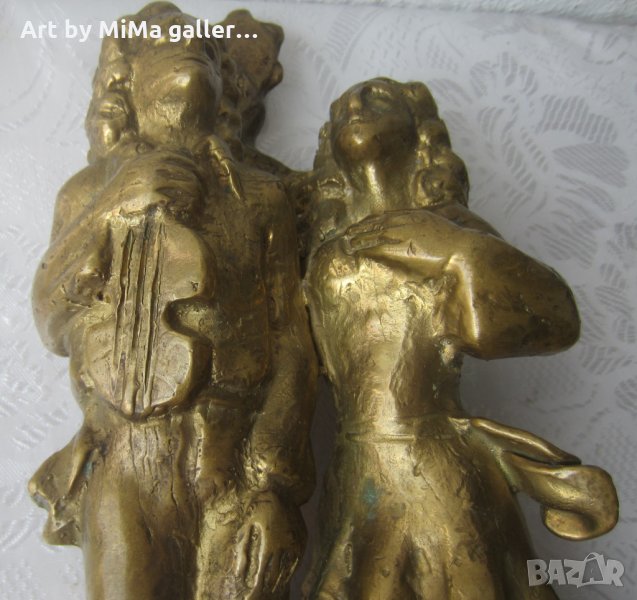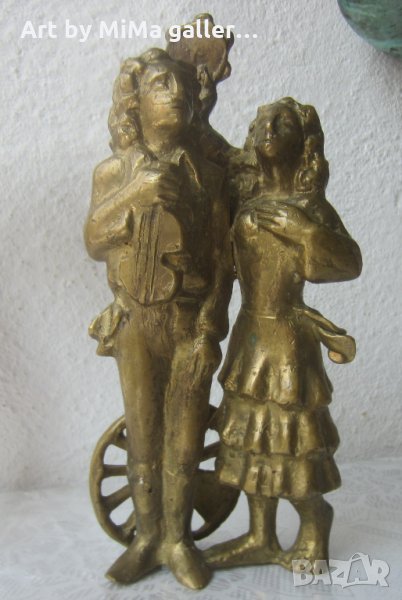 26 см, тежка, стара каминна фигура, подпис Fiko, мъж, жена, цигулка, цигулар, музикант, колело от каруца, цветен метал, автор, малка пластика