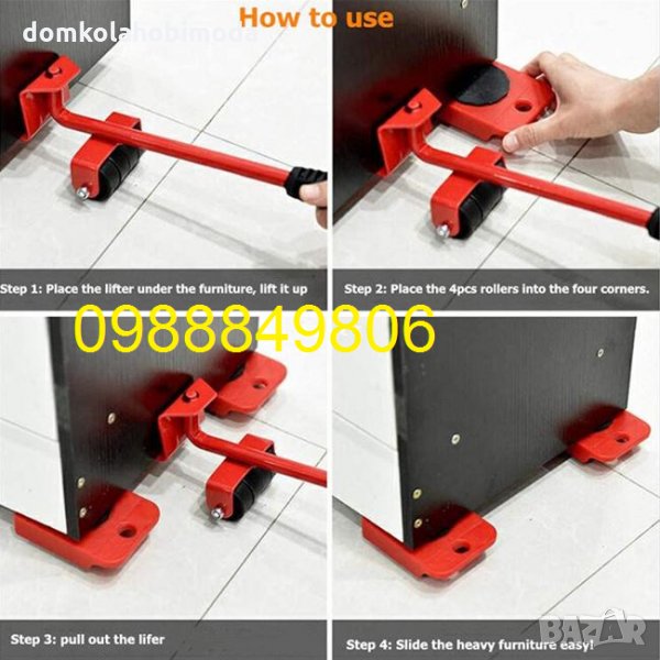 Комплект за преместване на мебели и тежки предмети . Поставете повдигащият лост под мебелите, за да ги повдигнете ( повдигайте мебелите до 5 сантиметра за да избегнете накланяне на мебелите) и след това добавете четирите подложки с колелата в ъглите. Лесно плъзнете мебелите до желаното място .