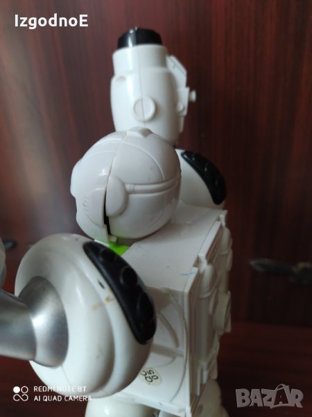 Много готин робот, свети, движи се и издава звуци. Още като го купихме, главата му имаше забележка. Пластмасата отпред и отзад са малко накриво залепени, имат луфт, но е стабилно залепено, не се клати..не е мръднала. Снимано е отблизо и се вижда. Иначе е запазен
