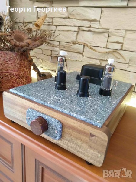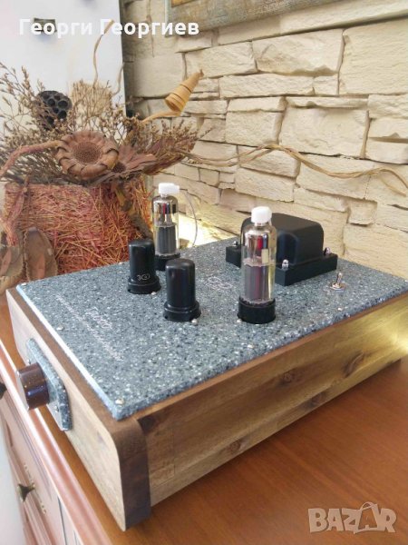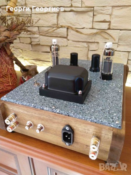 RFT, с фиксирано пренапрежение. Кондензаторна връзка между първата и втората лампа посредством прецизни безиндуктивни стирофлексни кондензатори К71-7. Кондензатори в катода на входната лампа – сребърно-танталови К52-2. Родиеви конектори Neotech RJ-133RT. Два захранващи трансформатора. Полупроводниково изправяне на анодното напрежение чрез Ultrafast Soft Recovery Diodes, използвани кондензатори по захранване Philips, Nichicon, Hitano Gold 100kHz; независими електронни дросели за всеки канал с активни елементи на VISHAY, автоматика за закъснително подаване и плавно нарастване на анодното напрежение с цел удължаване живота на лампите. Използвани резистори на MULTICOMP и TESLA. Окабеляване по сигнал – NOS коаксиален посребрен меден проводник на RFT, по захранване – OFC меден проводник, италианско производство. Изходни трансформатори на качествен Quad C- core с подходящо секциониране, изчислени и изработени лично от мен (усилвателят е подходящ както за 4-, така и за 8-омови озвучителни тела). Корпус от масивно дърво опушена акация, шаси и елементи по корпуса от технически камък. Изходна мощност – 4,5W/канал, честотна лента - 13Hz-35kHz, входна чувствителност 1V, входен импреданс 10kOhm.