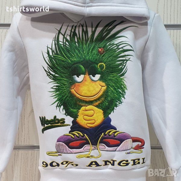 Страхотен нов детски суичър в бял цвят с качулка с трансферен печат 90% ангел. Произведен в България под марката PRINTEX от 100% висококачествен памук, което го прави изключително топъл и желан от нашите дългогодишни клиенти. Моделът е подходящ за пролетния и есенно-зимният сезон, има ластични маншети на китките и ханша, запазващи топлината. Меката подплата и свободната кройка го прави изключително удобен за нашите малки клиенти.