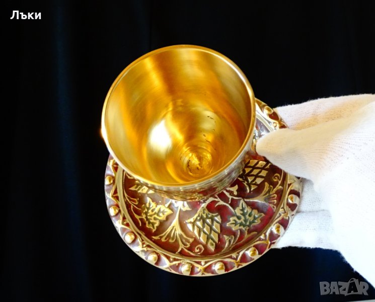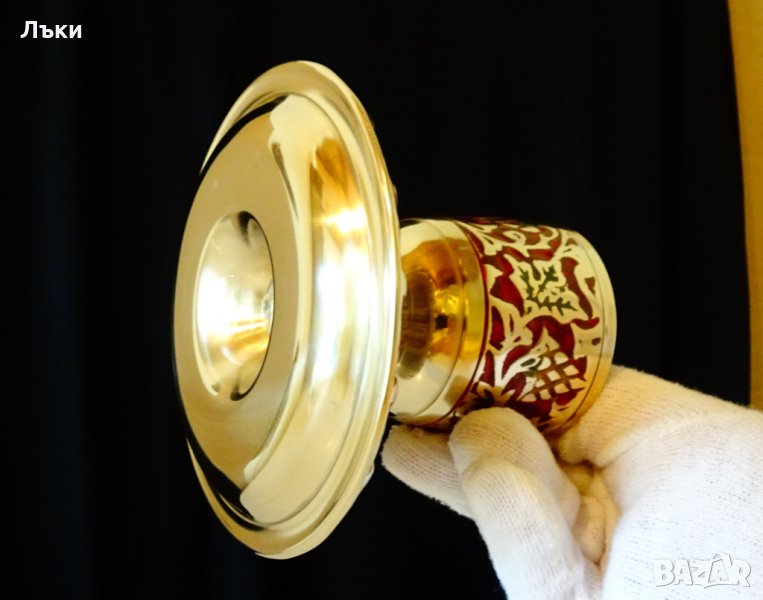 от масивен блестящ бронз. Релефно декорирано с лози и грозде-символ на Христос и християнската вяра.По периферията на основата има орнаменти загатващи Всевиждащото око Божие.Изработено от майстор виртуоз с прецизен ярък цветен клетъчен емайл.Височина 10 см.,диаметър