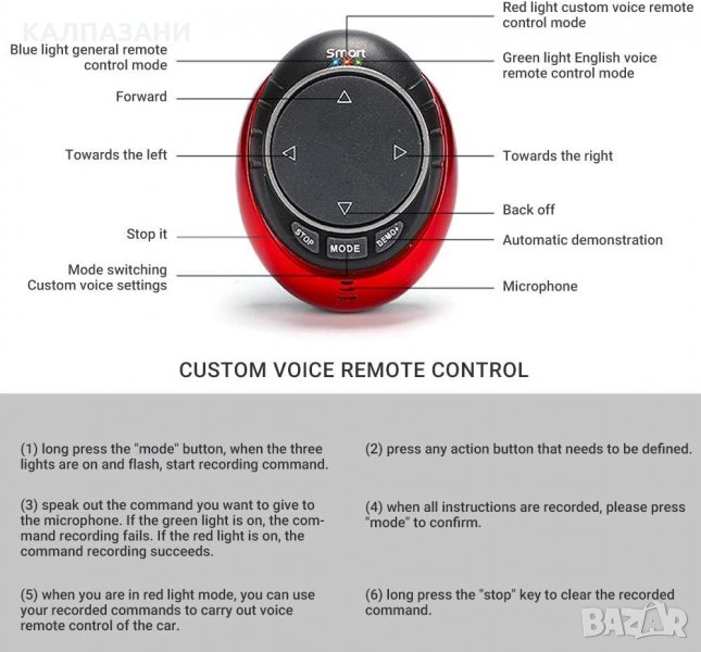 дистанционното управление поддържа предварително зададени английски гласови команди: