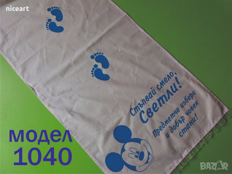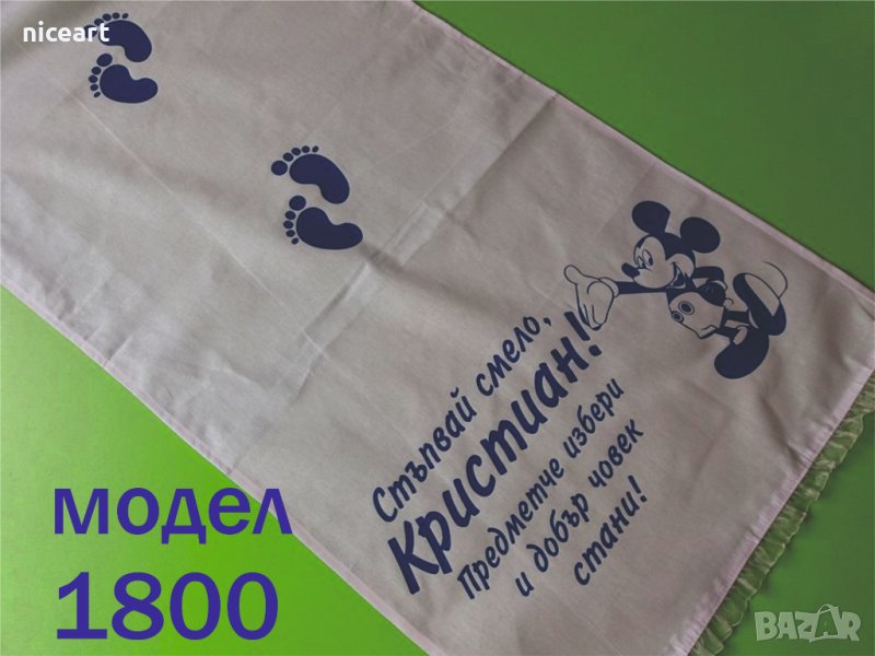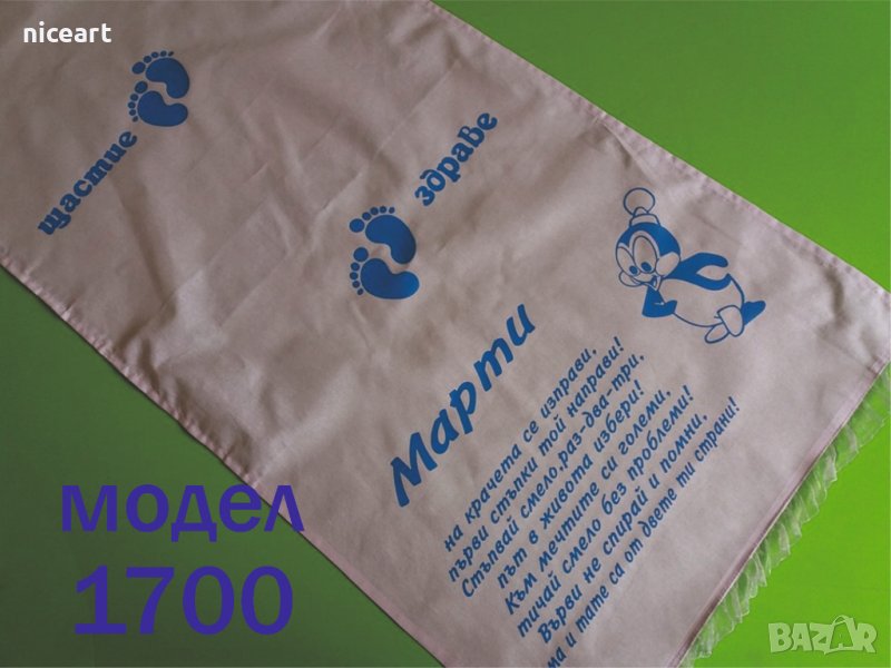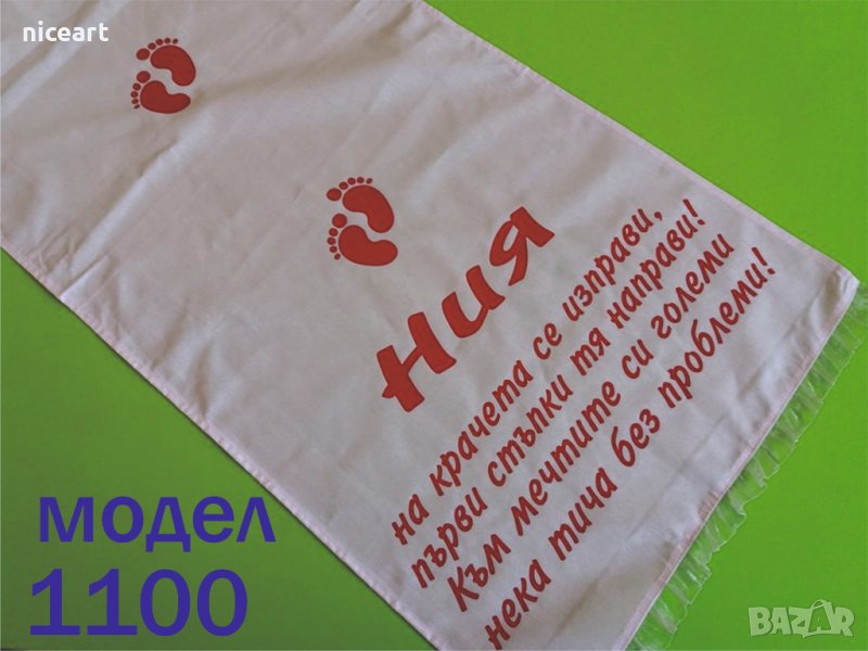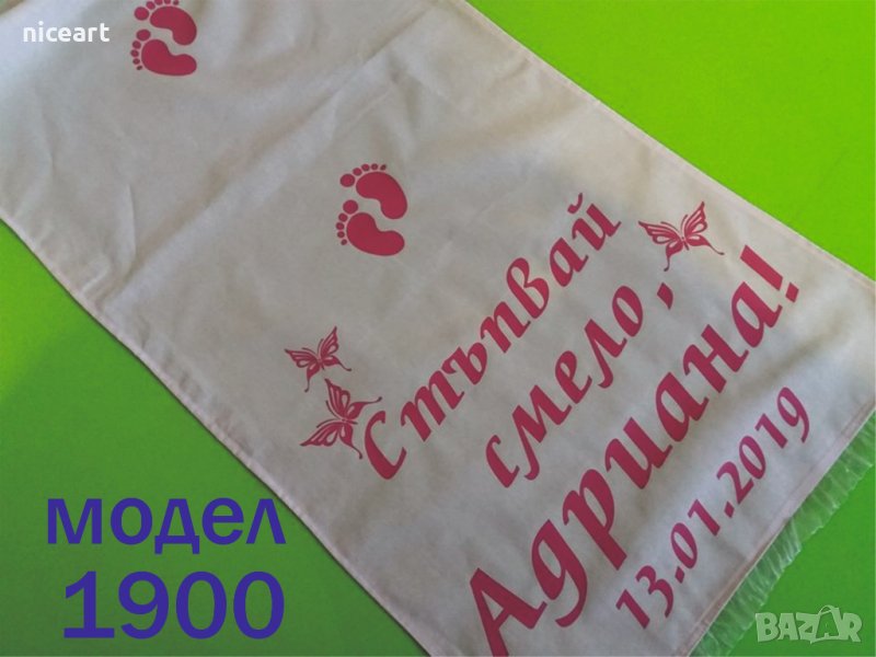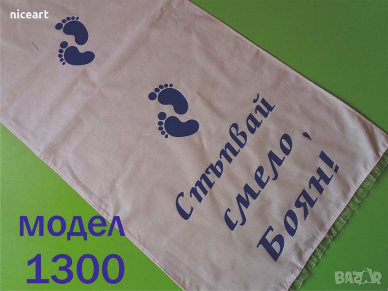 При нас може да поръчате пътечка за прощъпулник от модела на снимката или като изберете от някой от другите ни над 50 модела в обяви .Може да комбинирате с боди или тениска с надпис за прощъпулника на вашето бебе.