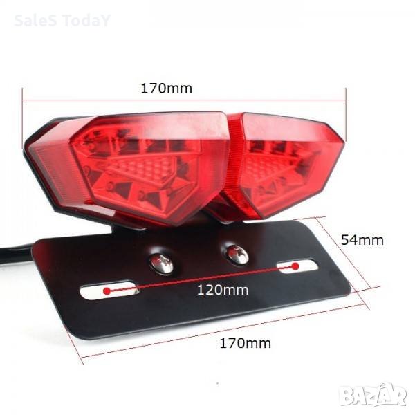 Характеристики:Светлини за мигачи, габарит, спирачна (стоп) светлинаУлтра ярките диоди осигуряват максимална видимост и безопасностУниверсален, съвместим с повечето мотоциклетиСпецификации:Осветление тип: LEDЦвят: черно с червеноМатериал: метален корпус, PVCНапрежение: DC 12VМощност: 16WМонтаж:Червен кабел - стоп светлина;Черен кабел - маса (-);Син кабел - десен мигач;Оранжев кабел - ляв мигач;Зелен кабел - габаритна светлина.Препоръчва се монтаж в сервиз !