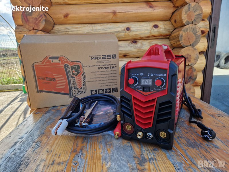 СПЕЦИФИКАЦИЯ: Дигитален дисплей, Автоматично охлаждане с вентилатори., Захранващо напрежение AC V 220/50Hz., Обхват на заваръчния ток /А/: 10-250 А, Тегло: 7 кг., Размери: височина 28 см., широчина 17 см., дължина 37 см., Степен на защита IP 21, Входяща мощност (KVA) MMA/TIG- 6,6/4,5., Консумирана мощност при 100% натоварване /250А/: ММА-28V/TIG-18V. Окомплектовка: кабел за маса, кабел с ръкохватка за електроди, аргонова ръкохватка /шланг за TIG заваряване/, маска и аксесоари.