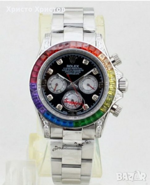 Луксозен ръчен часовник Rolex Daytona, автомат, водоустойчив ,полиран стоманен корпус L316 с разноцветни камъни и ринг с квадратни цветни камъни, черен циферблат с дата, ден, 24 часова позиция и стоманена верижка, клас ААА с оригинално закопчаване.