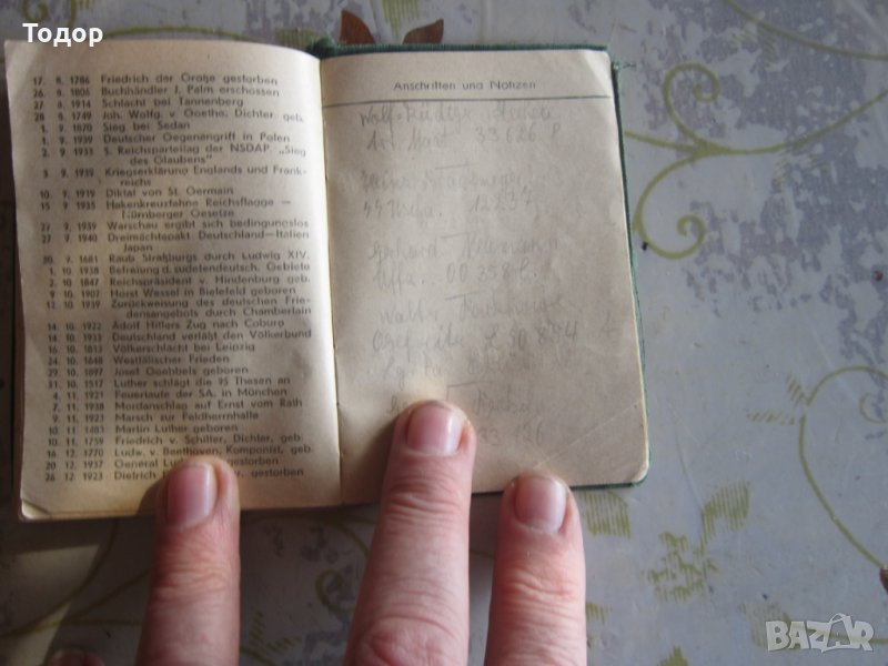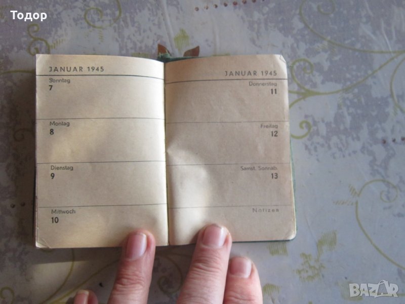 Старинен календар с четирилистна детелина между страниците На отделни дни има записки с молив и мастило Календара включва и първите 13 дни от 1945 Здрав Отлично за времето си състояние