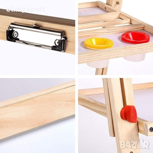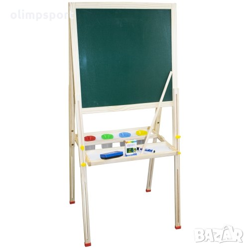 Дървена дъска за писане и рисуване, стояща, с регулируема височина от 79 до 141 см. , с 55 броя букви на кирилица. Включени са всички букви от българската азбука (по веднъж) и допълнителни гласни за съставяне на думи. С плот, на който има поставки за чашки за рисуване. Бяла страна за писане и рисуване с маркер и зелена - за тебешир; магнитна и от двете страни. В комплекта са включени гъба, маркер, чашки за рисуване, кутия цветни тебешири и дървена показалка. Подходяща за използване в детски градини, занимални, учебни центрове и у дома. Площта за писане на дъските е - 49x47 см