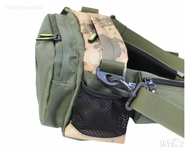 Спининг чанта за носене на кръста, предлагаща интелигентни решения за съхранение и достъп до вашите риболовни принадлежности. Изработена е от качествени материали, като двете основни отделения имат винилова облицовка отвътре и предпазват от влага. Комбинацията от цвят каки и камуфлажен десен дава на продукта перфекна визия, пасваща на риболовния стил.