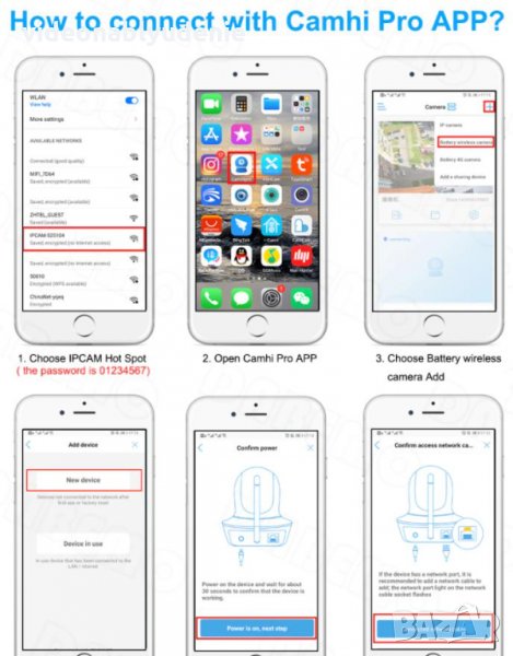Ползва апликацията "Camhi" или "Camhi Pro" за IOS и Android - приложена е инструкция за инсталация на Български език!