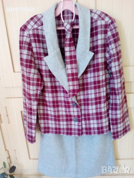 Вълнено право сако размер Л, гр обиколка 90, дължина 63см, към сакото има вратовръзка и пола с талия 70, ханш 90, дължина 76см -18лв.