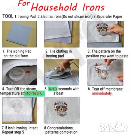 Поставете върху желана дреха -БЕЗ да премахвате защитно фолио , покрийте с парче плат,след което с топла ютия 120-150 градуса за 10-15 секунди минете отгоре ,след което отлепете защитното фолио.