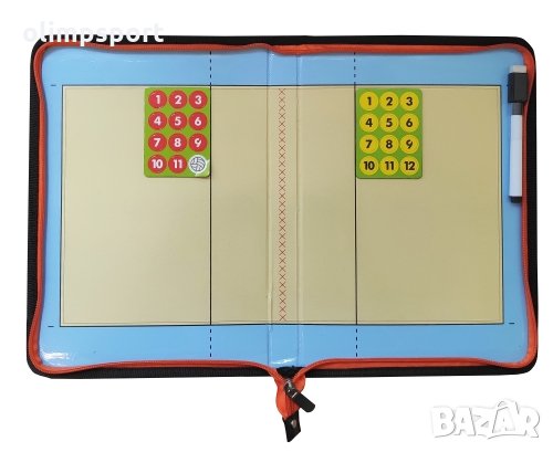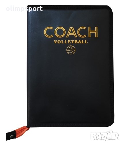 Дъска (папка) треньорска сгъваема за волейбол с цип. Дъска с кожен калъф с размери 42x28x1.5 см в разгънат вид. Подходяща за употреба в клубове и училища. Комплектът включва маркер за бяла дъска с магнит за закрепяне и гъба за лесно и сухо почистване, както и магнитчета за играчите на два отбора.