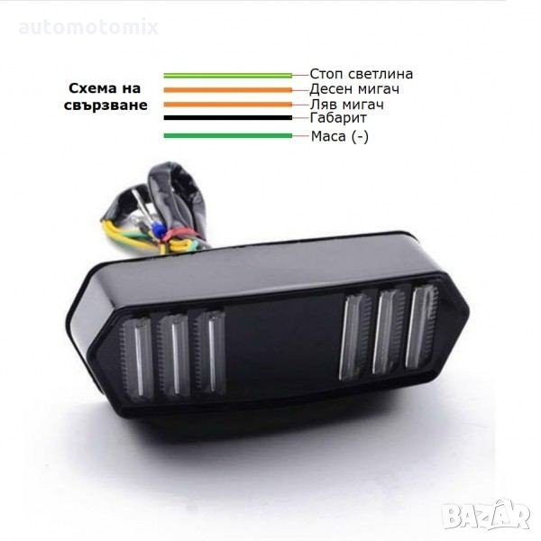 Вградена светлина за осветление на номера, мигачи, габарит, спирачна (стоп) светлина. Ултра ярките диоди осигуряват максимална видимост и безопасност. Универсален, съвместим с повечето мотоциклети.