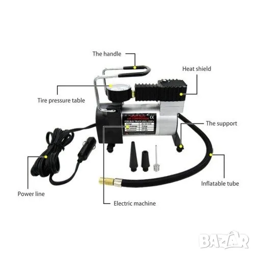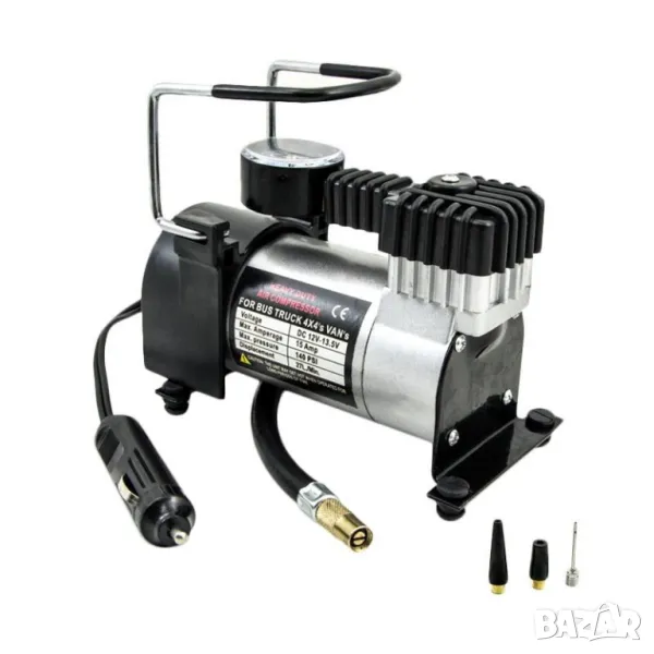 Интересното при този модел е, че той е по-устойчив от останалите. Това става благодарение на здравия метален корпус и подсилените маркучи и кабели. Можете да действате навсякъде с него, стига от запалката на автомобила, откъдето се извършва захранването, до желания обект за помпане, да има максимум три метра разстояние. Всъщност обсегът се увеличава с още цял метър, благодарение на дължината на въздушния маркуч. Захранването е със стандартните 12 волта, с ампераж 12.5.