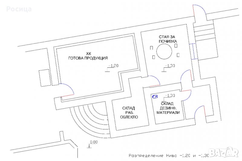 Разпределението в план на помещенията в цеха, както и вентилационните инсталации в подпокривното пространство са показани на снимките. Към предприятието има 1 декар двор с плътна ограда. Две топли камери, Дизел агрегат, Кладенец и 2 бр. Хладилни камери.