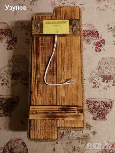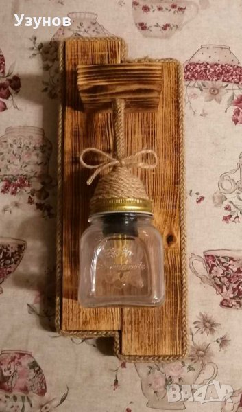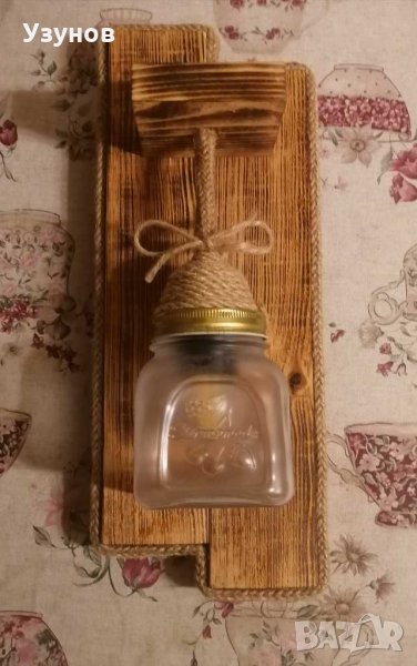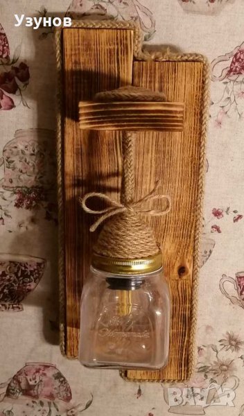 Продавам уникална, ръчно изработена, стенна дървена лампа (осветително тяло) от естествени материали - обгорено борово дърво и въжета от юта и коноп. Изключително подходяща за тераса,