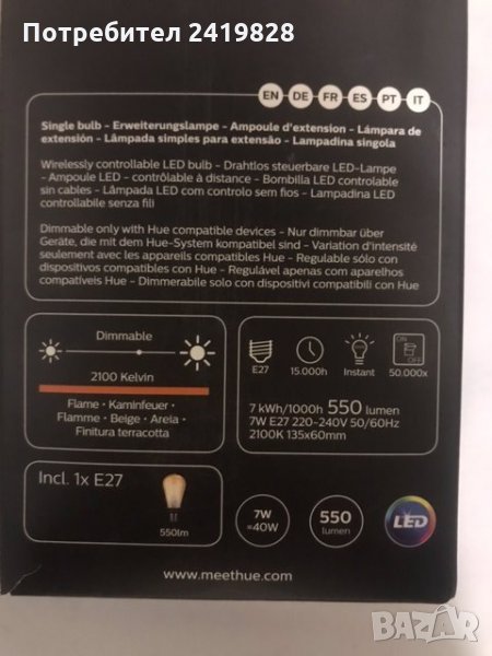 Крушка LED vintage Philips Hue, Bluetooth, снимка 1 - Крушки - 32114316 Крушка LED vintage Philips Hue, Bluetooth, снимка 2 - Крушки - 32114316 Крушка LED vintage Philips Hue, Bluetooth, снимка 3 - Крушки - 32114316 Крушка LED vintage Philips Hue, Bluetooth, снимка 4 - Крушки - 32114316 1/4