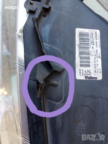 Продавам десен фар с пръскалка за Пежо 307 - 2004 година. Едната от трите щипки за захващане му е счупена.