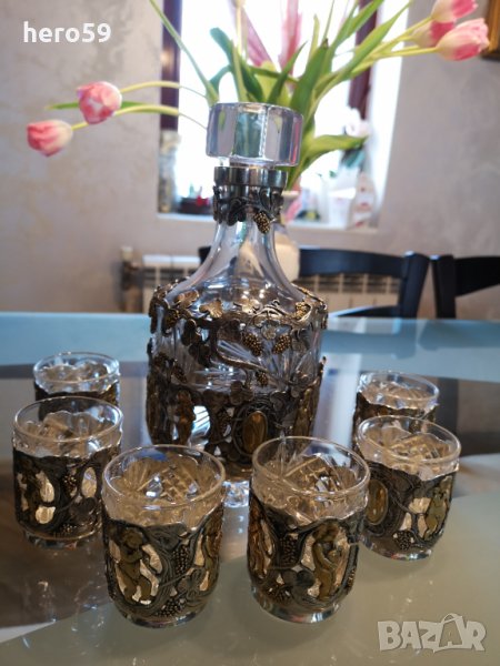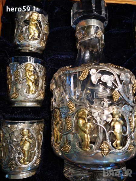 Предлагам за продажба уникален сребърен ,Царска Русия комплект(сребро и кристал)Може да се използва за уиски, коняк, ликьор водка,ракия,но по специална селекция.Вместимост на бутилката 800 мл.,а на чашите 100 мл.Височина на чашите 7см.,а на бутилката 24 см.Поръчкова нова прекрасна кутия за комплекта. Doamnelor si domnilor din Romania daca ma sunati la telefon va pot arata mult mai multe obiecte antice.Toate acestea le puteti obtine prin watsap.