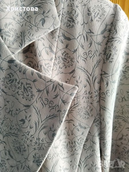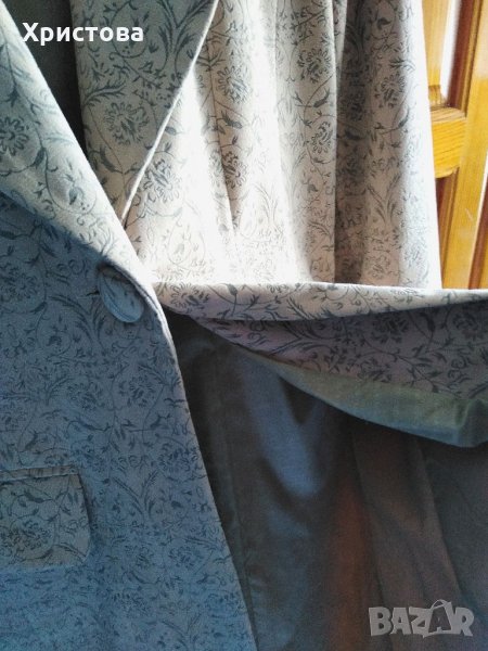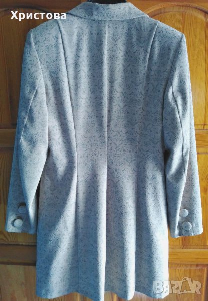 Елегантно светло бежово дълго сако с леко разкрояване в долната част на гърба, размер по етикет 42.С нежни релефни фигури върху плата, наподобяващ мек велур. С два предни джоба с капаци. Дължина от основата на яката 86 см, дължина ръкав 62 см.