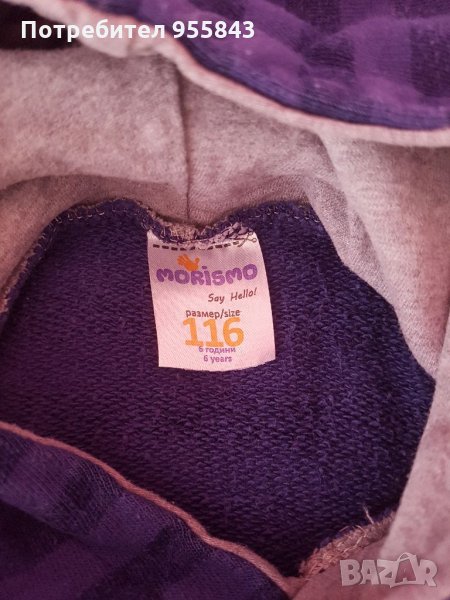 Спортна рокля с качулка от плътна материя! Подходяща за студено време. Размер 116 см, но като че ли е леко умалена. Има два джоба. Тъмно синя е, просто на снимката лилавее. С нормални следи от употреба.