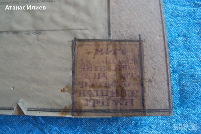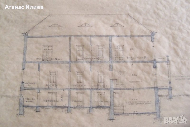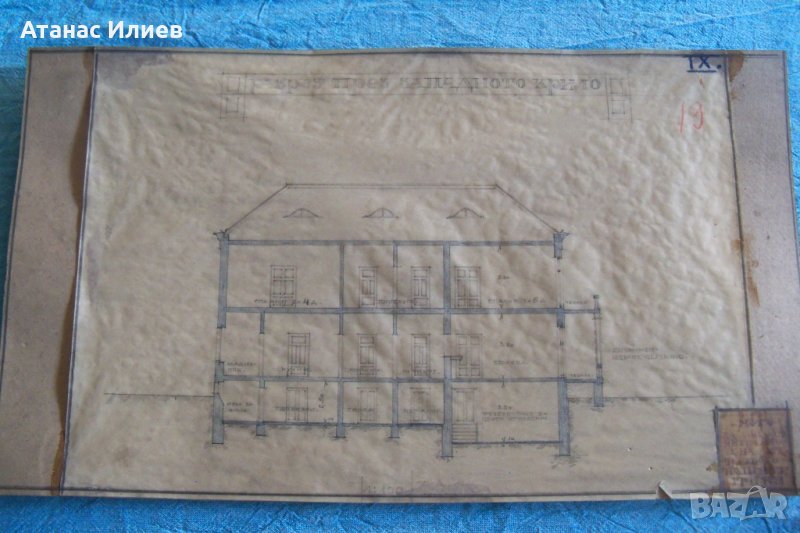 Красив стар архитектурен чертеж от преди 1944г. Чертежа е изпълнен на паус и залепен за тънък картон. Размери 49 х 28 см. В един от ъглите има надпис "За доблестните синове на отечеството нашите грижи".