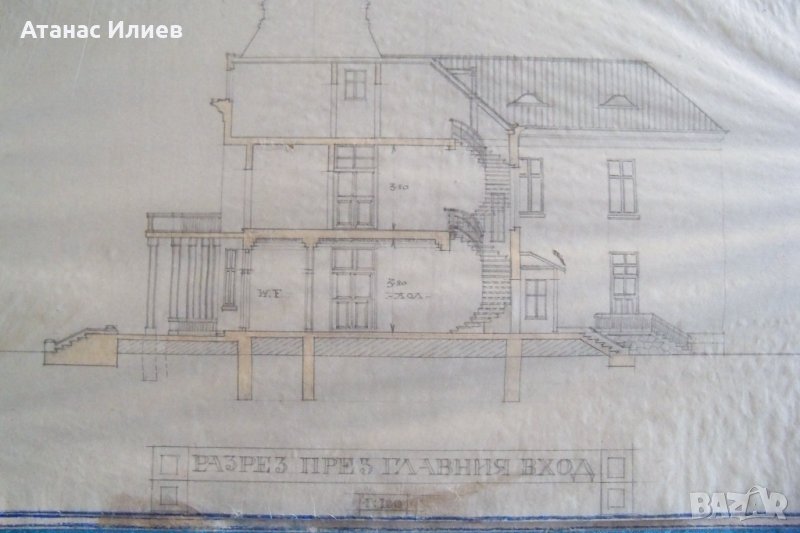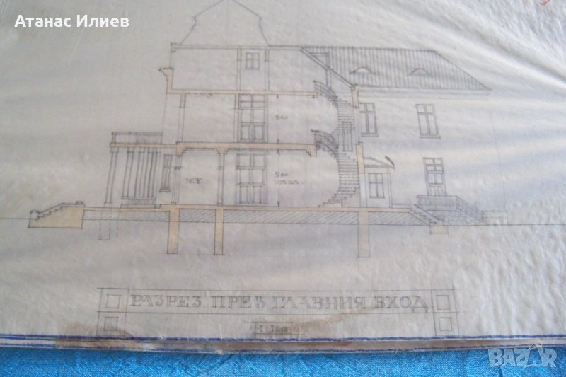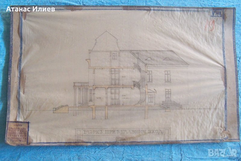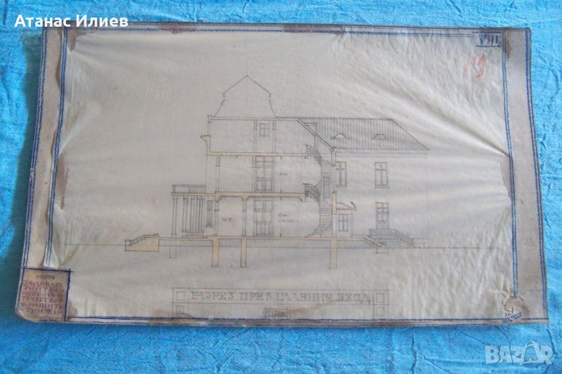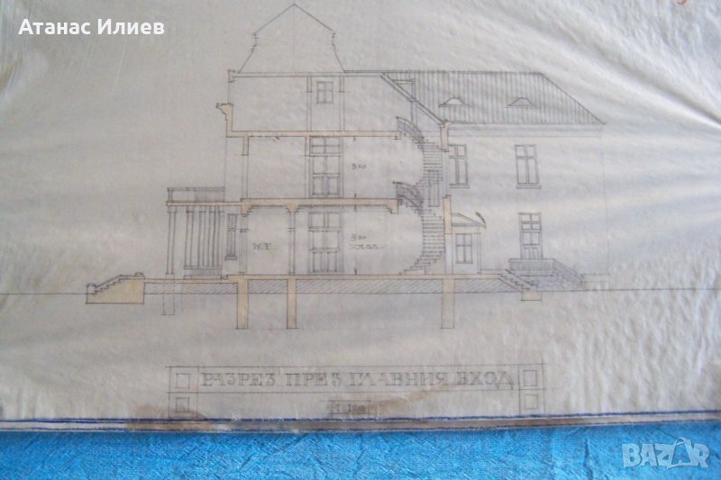 Красив стар архитектурен чертеж, скица, рисунка от преди 1944г. Чертежа е изпълнен на паус и залепен за тънък картон. Размери 30 х 50 см. В един от ъглите има надпис "За доблестните синове на отечеството нашите грижи".