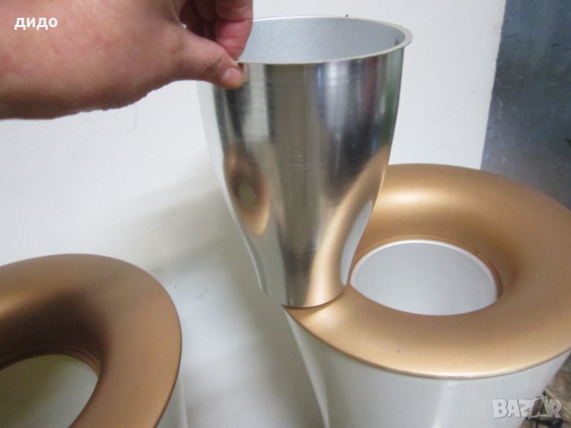 Две големи лампи с височина 80см.,диаметър в горния край 30см.Лампите са с обикновена фасунга,реле за усилване и намаляне на осветлението.Вътре има метална чаша,ако се махне свети цялото тяло.Цената е за брой.Внос Германия.