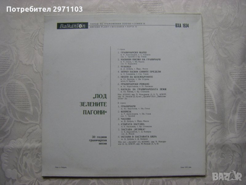 Изп. АПМНО, дир. Ч. Маждраков (1, 6, 7), АПКТР, дир. М. Милков (2, 3), октет "Дружба "(4) и "Хайдушка песен" (5)
