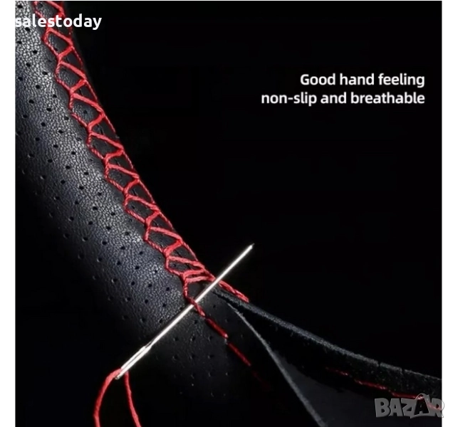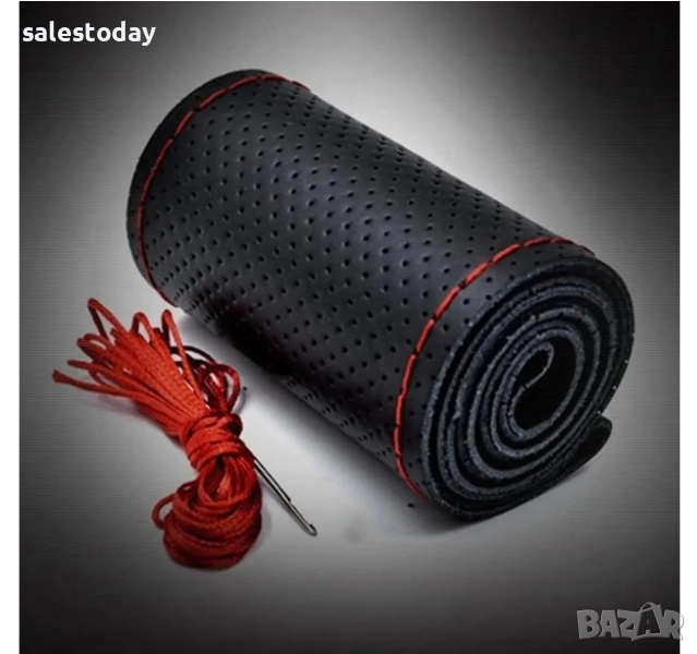 Калъф за волан от еко кожа, перфо кожа, М, 38см, за шиене с червен конец