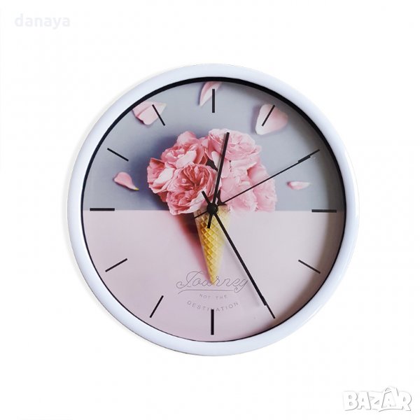 Стенен часовник с красив принт на сладолед от розови цветя. Кръгла бяла рамка, която ще пасне на всеки интериор. Ще стои прекрасно в кухнята или офиса. Кварцов механизъм.