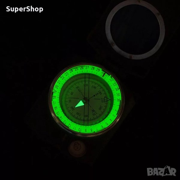Призматичен компас с метален корпус. Компасът е с връв за лесно пренасяне и калъф. Задната част има кука за закачване. Компасът разполага с фосфоресцираща скала.