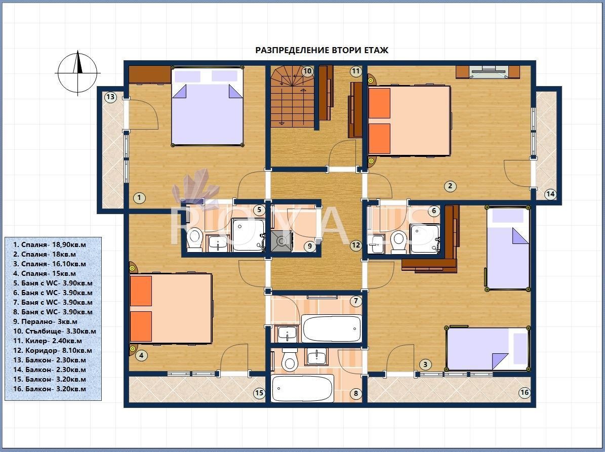 Реф.номер 15642; УНИКАЛНА ПАНОРАМА! ИЗЛОЖЕНИЕ ЮГ! ИЗРЯДНИ ДОКУМЕНТИ! Агенция ROYALS Ви предлага двуетажна къща с РЗП 358 кв.м. в кв. Изгрев, Варна. Домът има прекрасна панорама към морето и целия залив от кота 'нула'. Къщата е двуетажна с трети тавански етаж със следното разпределение: На първи етаж са разположени просторен дневен тракт с кухненска част, трапезария и мека мебел с обща площ 70 кв.м. и веранда пред него 30 кв.м. с прекрасен изглед, спалня 12 кв.м., кабинет 12 кв.м., баня с тоалетна в едно, входно антре, коридор, стълбищна клетка. На втория етаж има четири спални, като всяка от тях има баня с тоалетна и тераса към стаята; килер, перално помещение и коридор. Спалните са големи - с площи между 15 и 19 кв.м. Таванското помещение е с площ 55 кв.м. Домът е ориентиран на юг. Къщата е разположена в парцел, който след отнемането за бъдеща улична регулация би останал с площ 698 кв.м. Къщата се издава на БДС, в момента се извършват довършителни дейности. Строителство с качествени материали, има поставена външна изолация, инсталация за водно подово отопление и др. Имотът е с изрядни документи.