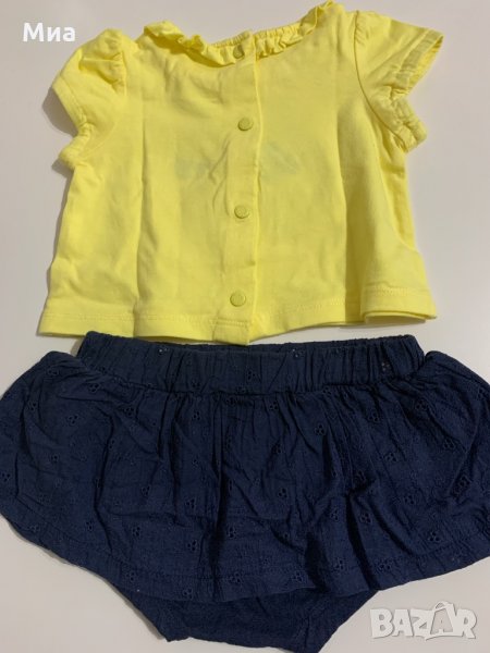 Бебешки комплет от две части Brums, размер 68 см, блузка в жълт цвят със син надпис и панделка, отзад с копчета и лого на марката, пола с гащички в син цвят. Слагани веднъж, без забележки!
