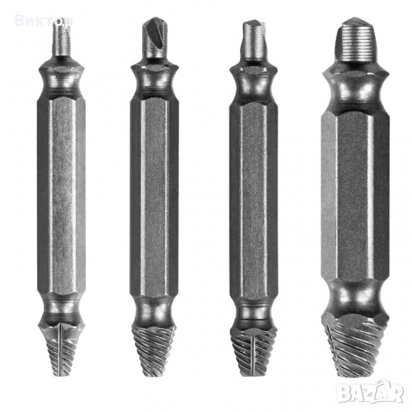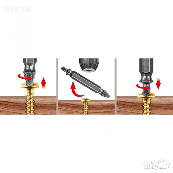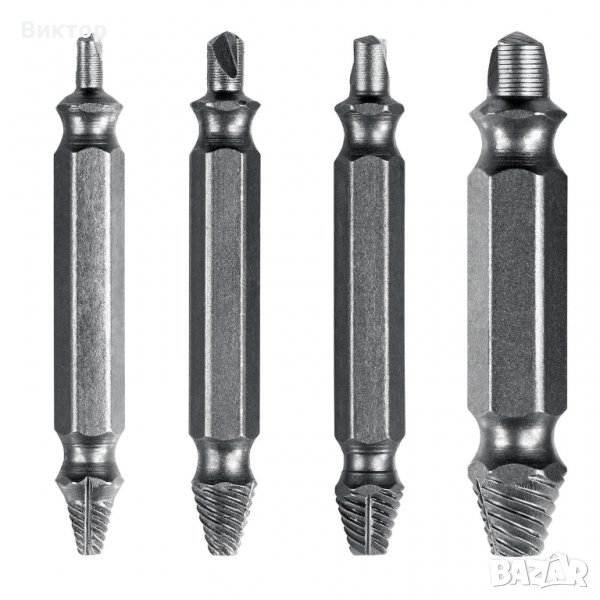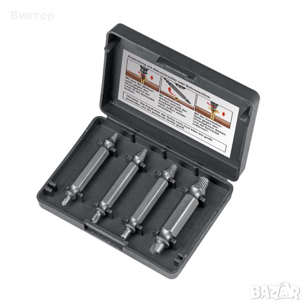 Сега има бързо и лесно решение за всички трудни винтови кутии: комплектът за отстраняване на винтове EASYmaxx! Четирите различни бита, всеки с 2 страни (1 x за пробиване и 1 x за развиване), могат да бъдат затегнати във всяка търговска бормашина.