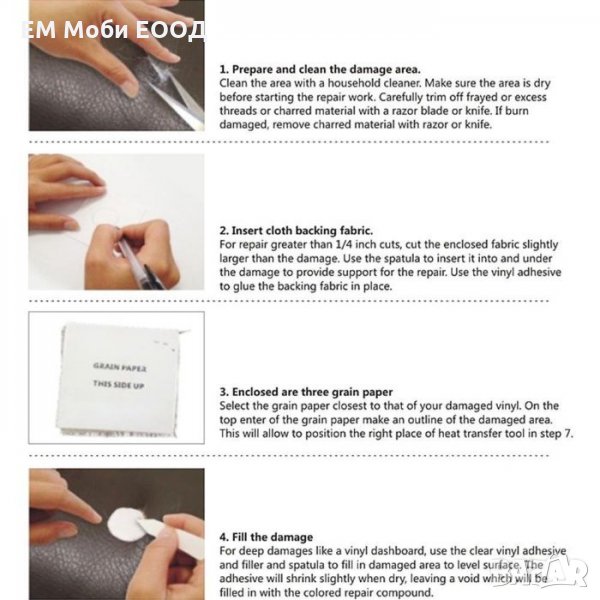 Много добър ремонтен комплект, с който да поправите кожения салон на автомобила си, а също така върши и страхотна работа и за други предмети от кожа, като яке, диван или кожен стол.