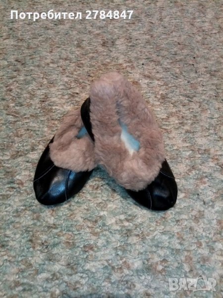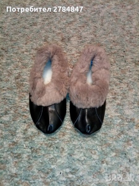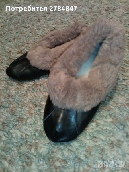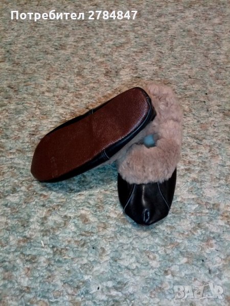 Детски пантофки - шити, черни, кожени, в горната част обшити с бежова пухкава материя.