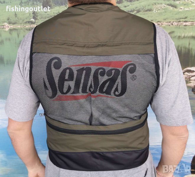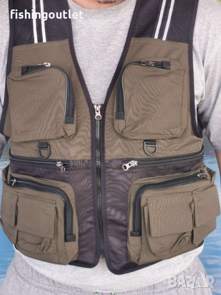 Функционален рибарски елек изработен от здрава материя , подходящ за мухарски , спининг и риболов на плувка .