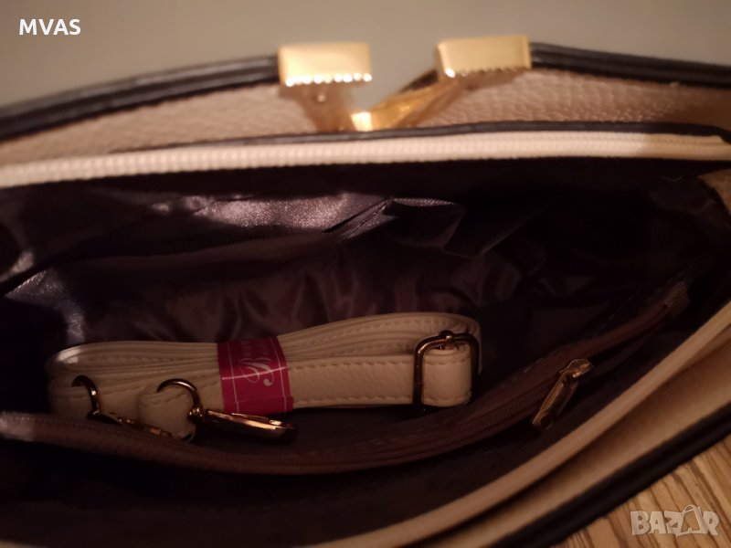 Плътен хастар, удобно разпределение - 2 отделения + 1 тайно с цип,2 малки свободни джоба, малък джоб с цип вътре и един от външната задна страна.