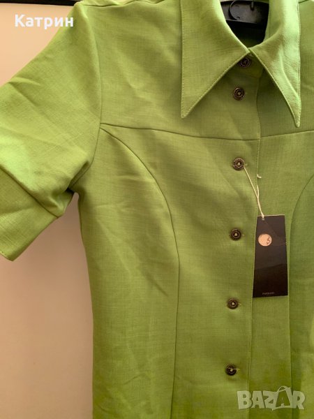 Рокля с късо ръкавче от полиестер с еластан в зелено. Закопчава се отпред с копчета.