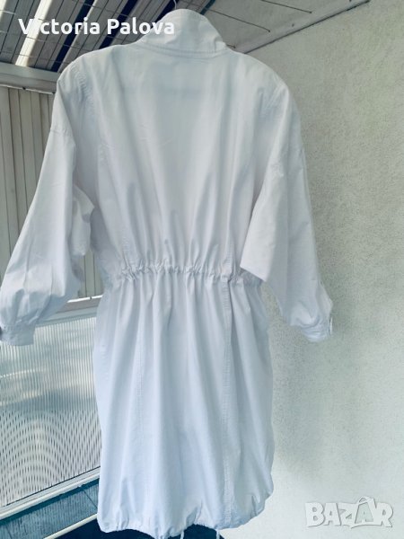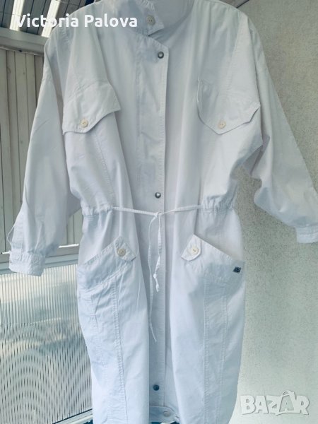 Интересна и функционална дреха-груб памук(като деним).може да се ползва и като манто,и като самостоятелна дреха(рокля или дълго яке).хипертрофирано широко,рамото е паднало-79см между ръкавите,които са 47см дълги и 40 см широки горе към рамото.ГО-78см,дължина-109см.ушито е като спортна дреха -външни джобове,пристяга се с връв на талията и долу (при желание).,лесно се поддържа-пере се и на високи градуси.