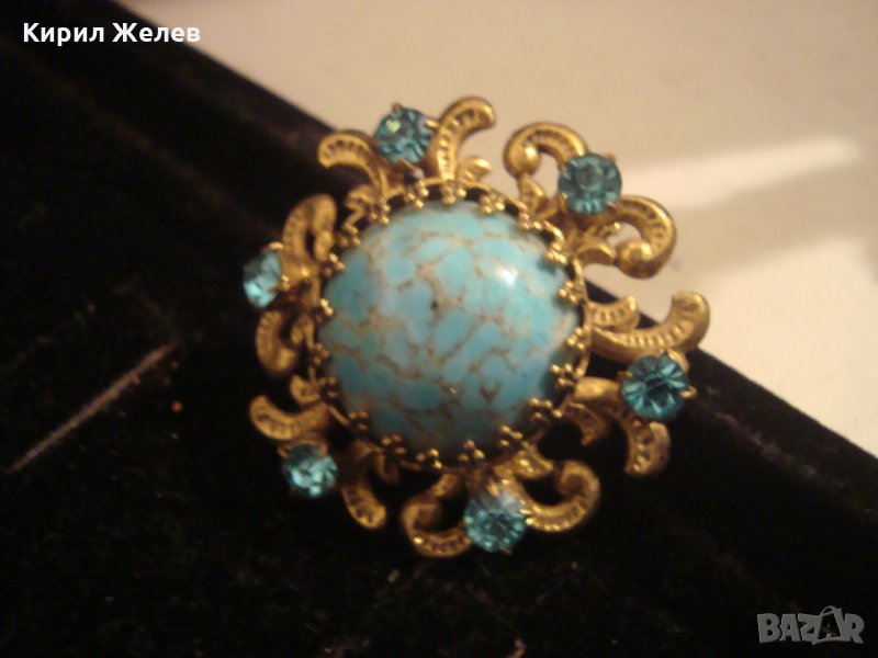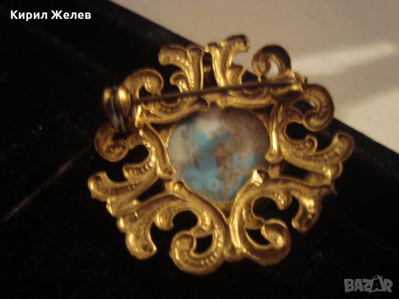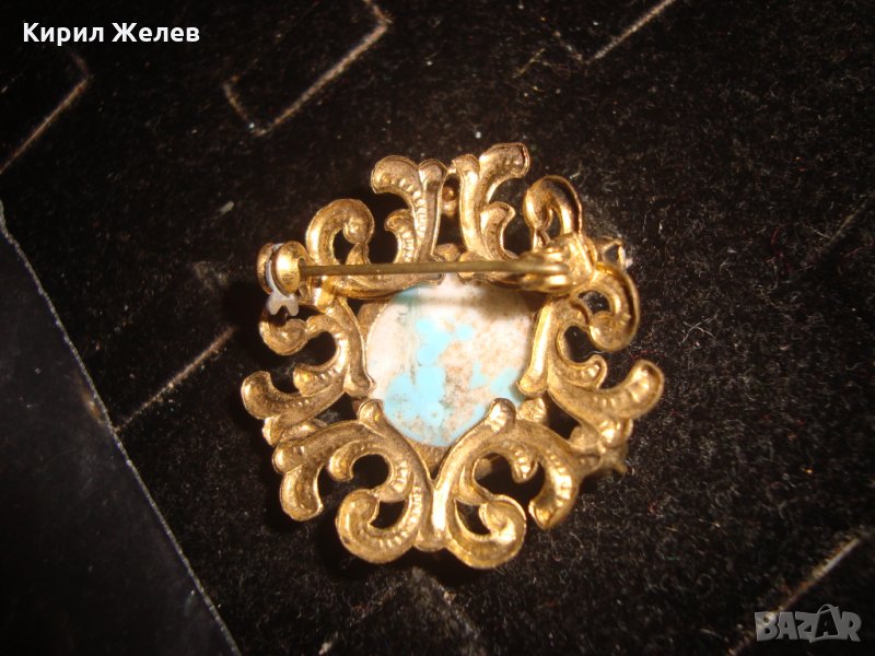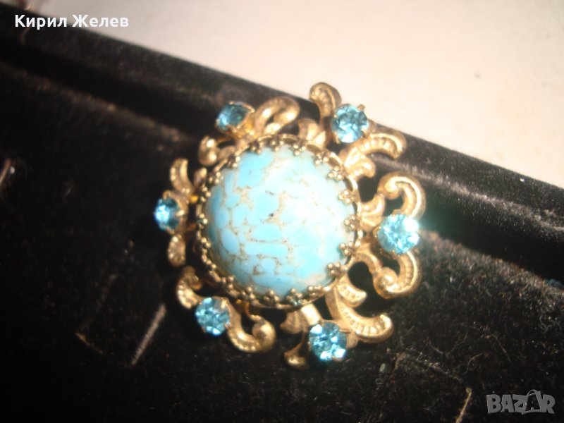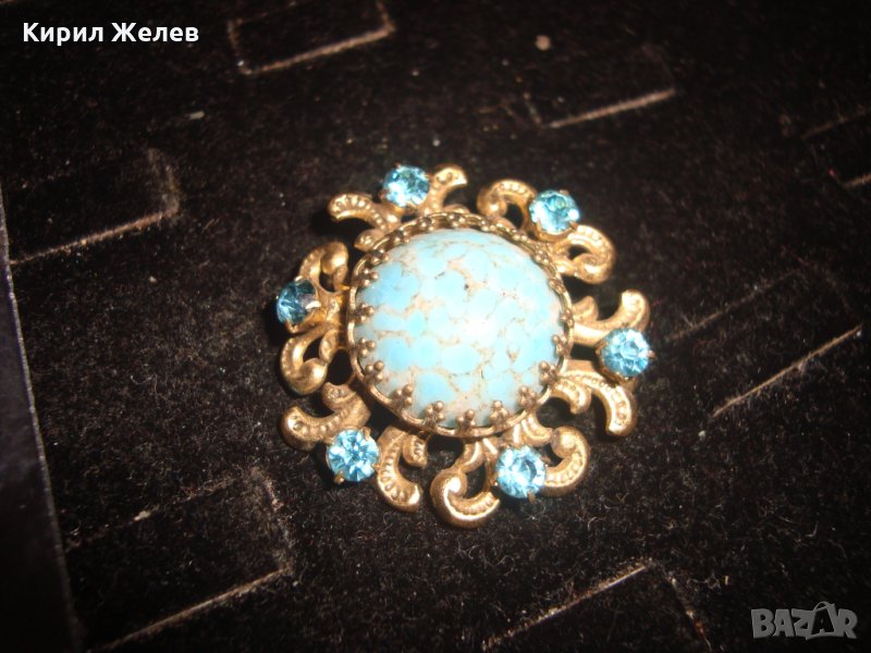 СТАРИННА АРТ ДЕКО ПОЗЛАТЕНА БРОНЗОВА БРОШКА с ЕСТЕСТВЕН ТЮРКОАЗ и САПФИР-КРИСТАЛ КАМЪНИ